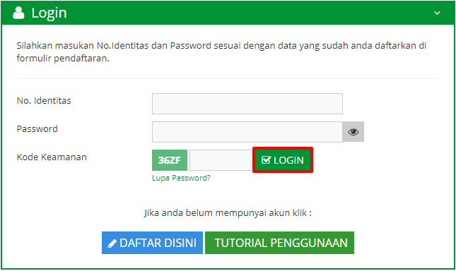 - Login terlebih dahulu dengan memasukkan No. Identitas dan Password, serta inputkan kode keamanan yang tampil. Setelah itu klik tombol "Login"